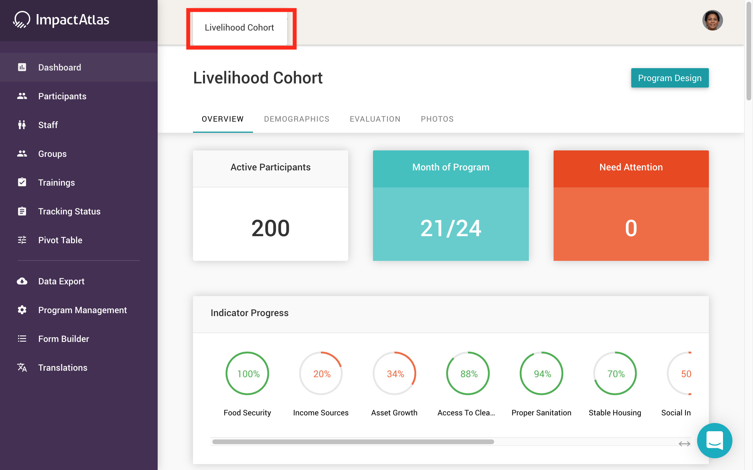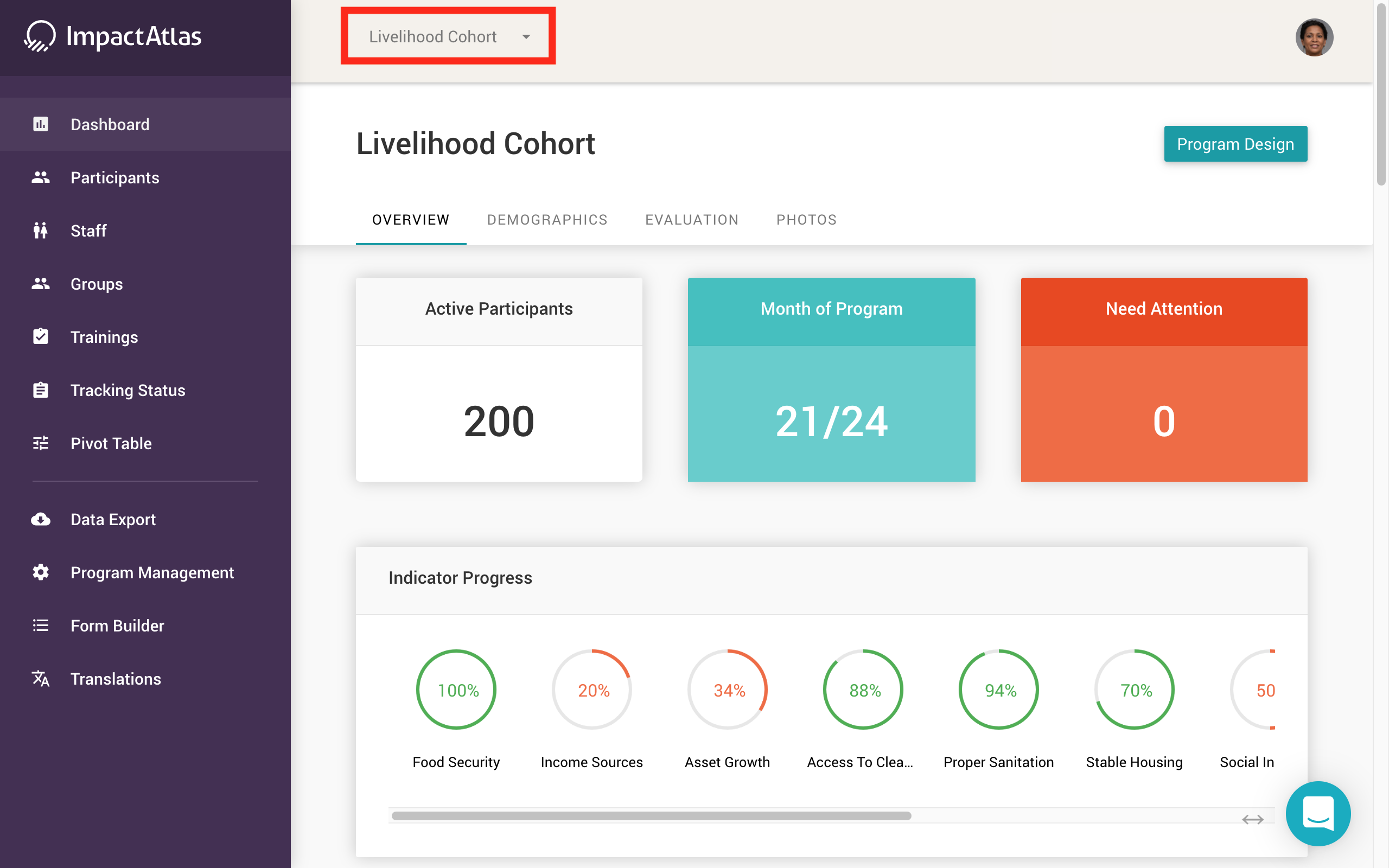 Once you click the down arrow, the cohorts you have on Impact Atlas will be visible and you can simply click on the one you wish to view.