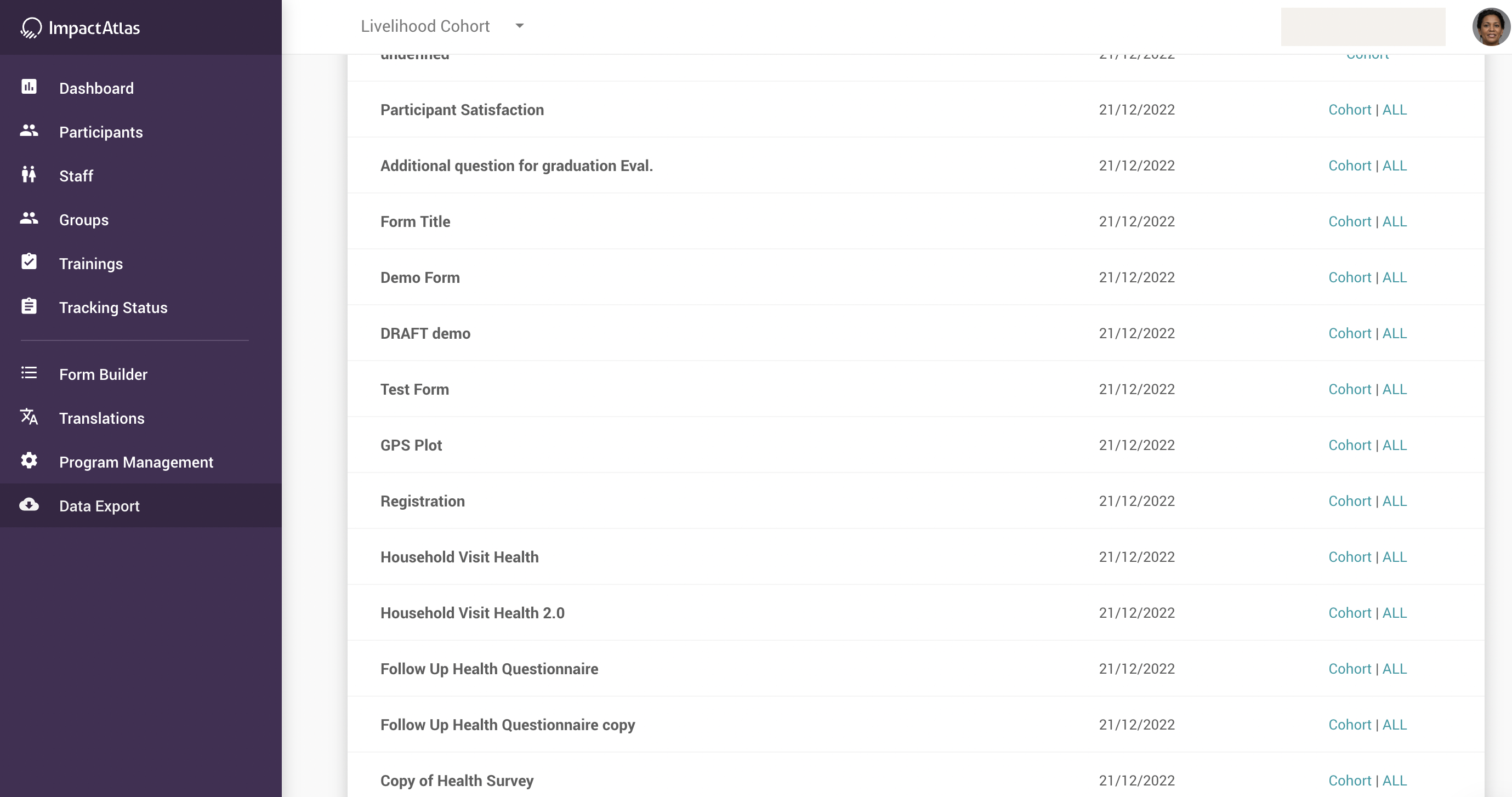 Cohort: data export from only the specific cohort you are logged in;