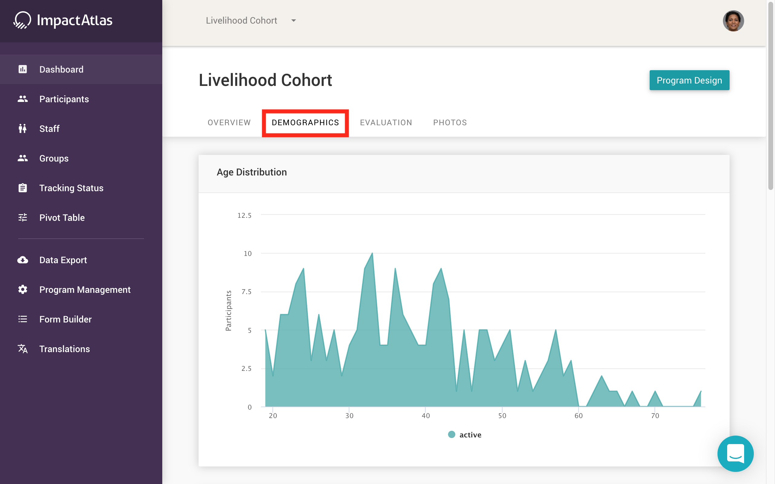 Using the top navigation panel, you can view program demographics, evaluations, and photos in greater detail. Simply click on any of those options to view graphics that illustrate the data you have collected during the program in those categories.